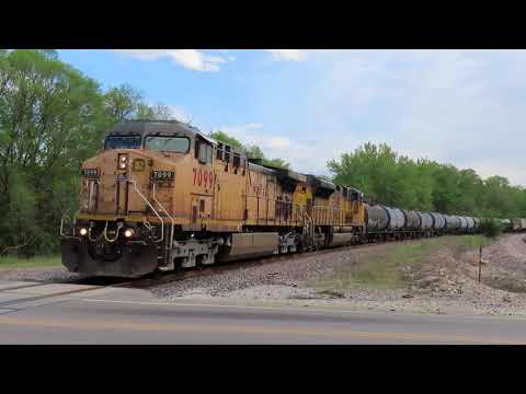 CAPTION: Union Pacific train MPECL (Manifest, Peoria IL to Clinton IA) rolls by W. Farmington Road shortly after departing Peoria, Illinois late-afternoon Tuesday, April 30, 2024. UP 7099 and UP 8950 have 40 cars.