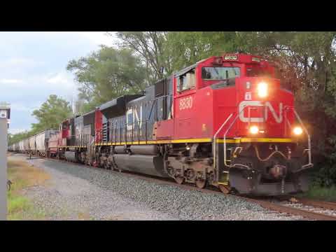 CAPTION: Canadian National Railway train L557 (Local, E. Peoria IL to Decatur IL) rolls out of Pekin, Illinois after switching Amerhart Ltd and Hanna Steel Corp. shortly after sunset Thursday, August 28, 2025. CN 8830 and CN 5654 have 38 cars.