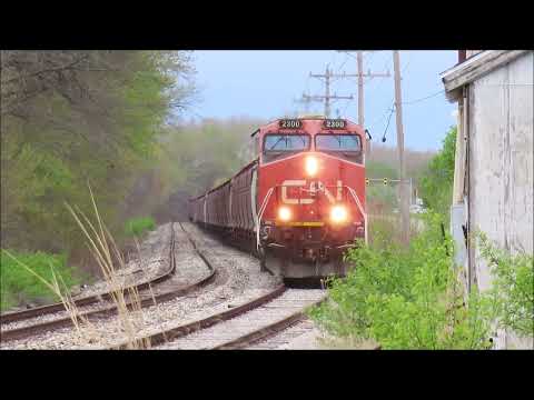 CAPTION: Canadian National Railway grain extra G888 (E. Peoria IL to Helvetia LA) is shown in various stages and at various locations on Saturday afternoon, April 11, 2026. The crew ran engine lite from the Tazewell & Peoria Railroad's Creve Coeur Team Track down Main No. 1 then crossed over to No. 2 to attach to the train at Hilliards. After departing an hour later, power runbys are shown there and at Pekin (Worley Lake, Lakeside Cemetery, 2nd Street and IC Junction). The whole train is shown at Fifth Steet near South Pekin. It originated on the Iowa Interstate at Newton, Iowa. CN 2300 and CN 5773 have 107 soybean loads.